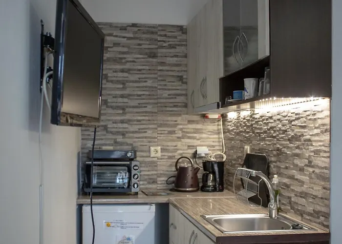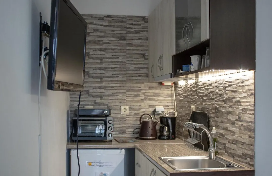 Das Mamouth Studios verfügt über eine Küche mit einer Kaffee-/Teemaschine, einem Kühlschrank und Küchenutensilien für Ihren Komfort. Das Mamouth Studios ist in unmittelbarer Nähe von der Bushaltestelle Agios Charalampos.